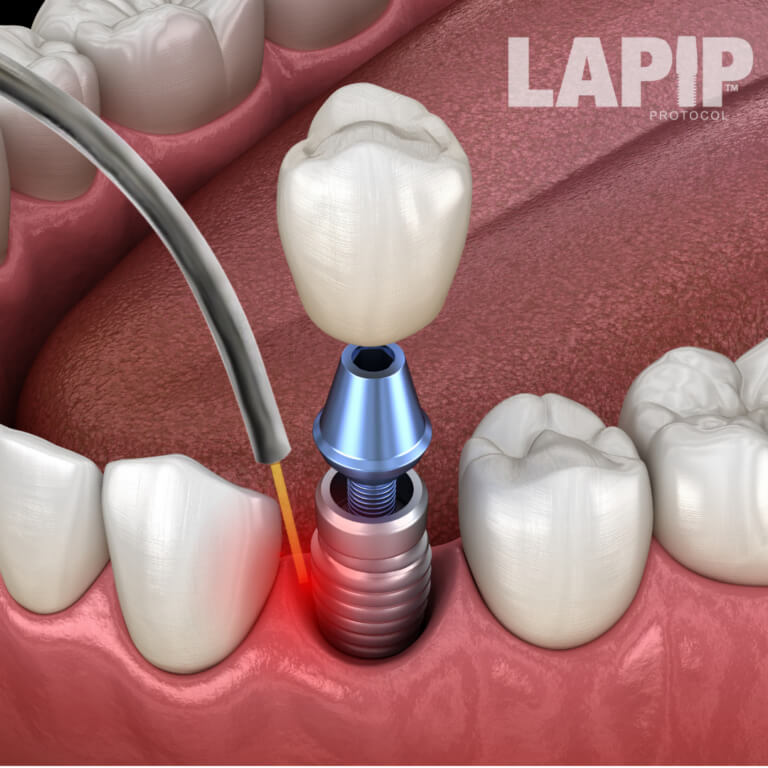 LAPIP (Laser-Assisted Peri-Implantitis Protocol) was created to treat peri-implantitis, a condition created by a bacterial infection between the implant surface and gum and bone tissue. Similar to periodontitis, peri-implantitis destroys bone tissue supporting the implant. And just as periodontitis can cause tooth loss, peri-implantitis left untreated eventually leads the loss of the dental implant.